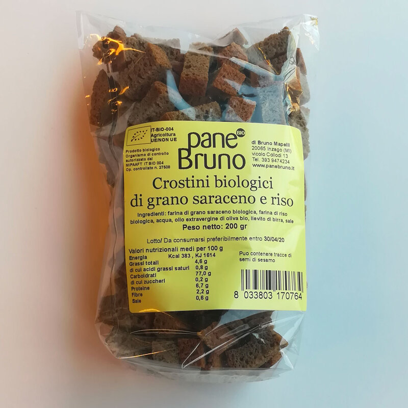 Organic buckwheat and rice croutons Delicious croutons made from fresh, specially produced, oven-dried and NOT FRIED. Ideal for soups and salads. Made from naturally gluten-free cereals, they can be used by all those who do not wish to consume cereals containing gluten, bearing in mind that they are processed, albeit with great care to avoid contamination, in a laboratory that also processes cereals containing gluten and therefore cannot be certified gluten free. They can also be a tasty and crunchy snack.Ingredients: organic buckwheat flour 50%, organic rice flour 50%, water, organic extra virgin olive oil, brewer's yeast, salt. May contain traces of sesame seeds. Quantity: 200 g. BIO certification: Suolo e SaluteIT BIO004 27508. Packaging: transparent bag. Minimum guaranteed shelf life: 30 days – to be stored in a cool, dry place.Average nutritional values per 100 g. Energy Kcal 383 Kj 1614. Total fat 4,6 g. of which are saturates 0,8 g. Carbohydrates 77,0 g. of which sugars 0,2 g. Protein 6.7 g. Fibre 2.2 g. Salt 0.6 g.