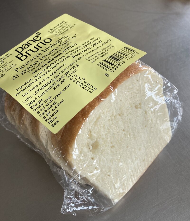 Organic whole-wheat Pancarrè bread without ethyl alcoholSoft, leavened with sourdough, WITHOUT ETHYL ALCOHOL, with extra virgin olive oil. Ideal for breakfast, both sweet and savoury. Ingredients: organic flour, water, organic extra virgin olive oil, natural yeast made from organic wheat flour, brewer's yeast, salt. May contain traces of sesame seeds. Quantity: 250 g. BIO certification: Suolo e Salute IT BIO004 27508. Packaging: in "greenfilm" shrink wrap. Minimum guaranteed shelf life: 10 days when stored in the fridge. Pancarrè is made with sourdough, essential for a long shelf life. If kept in the refrigerator, it may show an apparent lack of freshness. To avoid this, we recommend warming it up before eating so that it regains its aroma and crunchiness.Average nutritional values per 100 g. Energy Kcal 268 Kj 1129. Total fat 4.6 g. of which are saturates 0.6 g. Carbohydrates 43,4 g. of which sugars 1,4 g. Protein 9.1 g. Fibre 8,1 g. Salt 0.3 g.