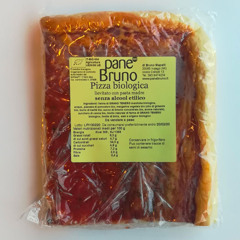 Ingredienti: farina di grano tenero manitoba biologica, acqua ,passata di pomodoro biologica, margarina vegetale biologica (